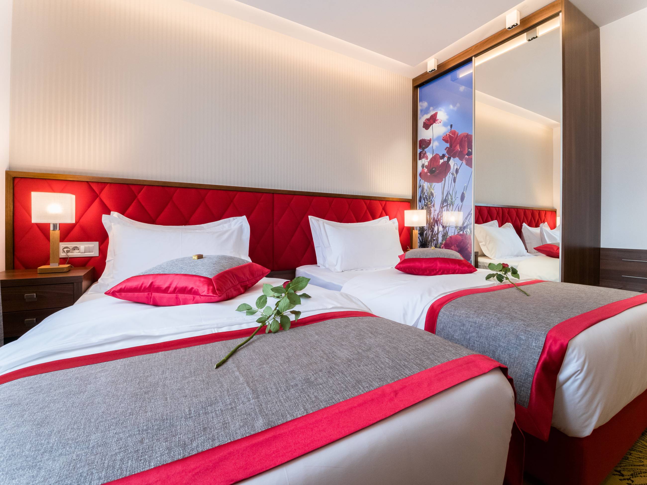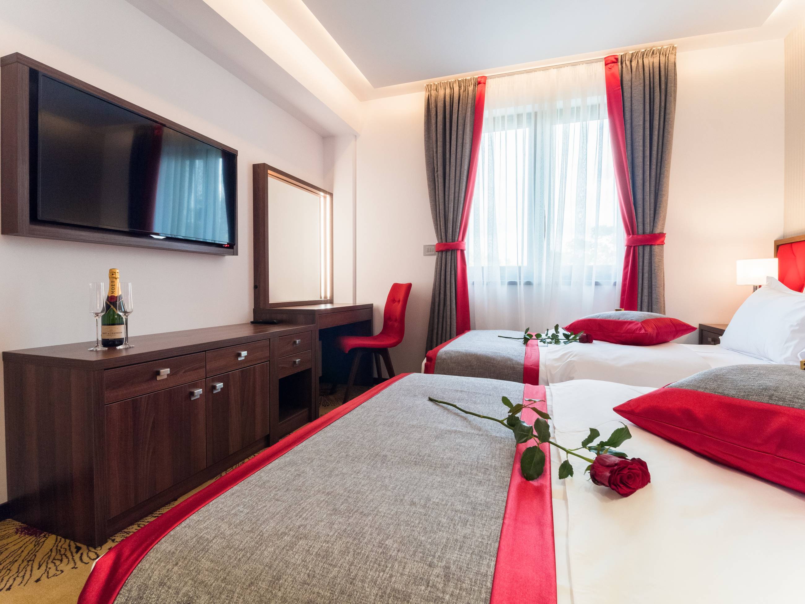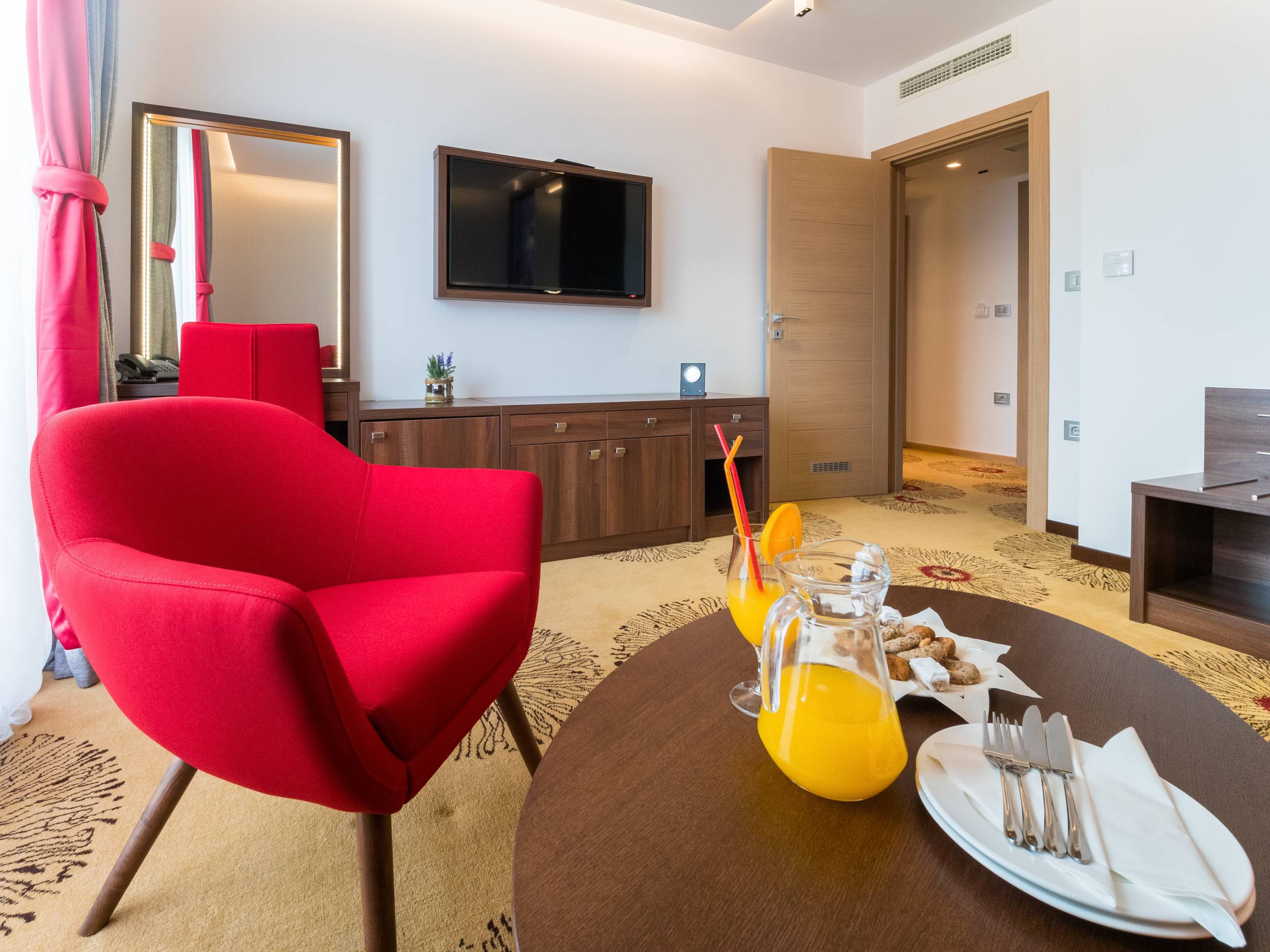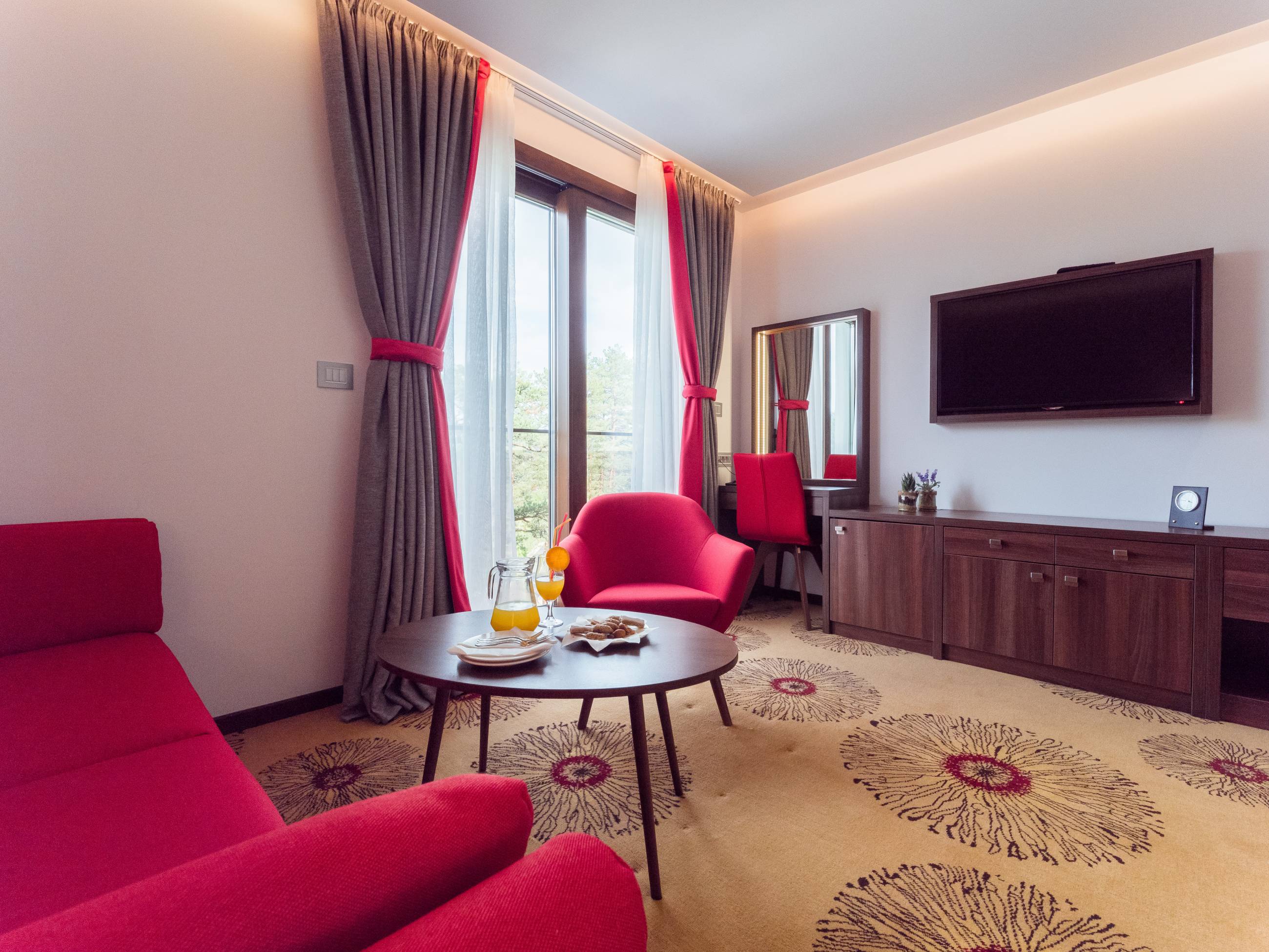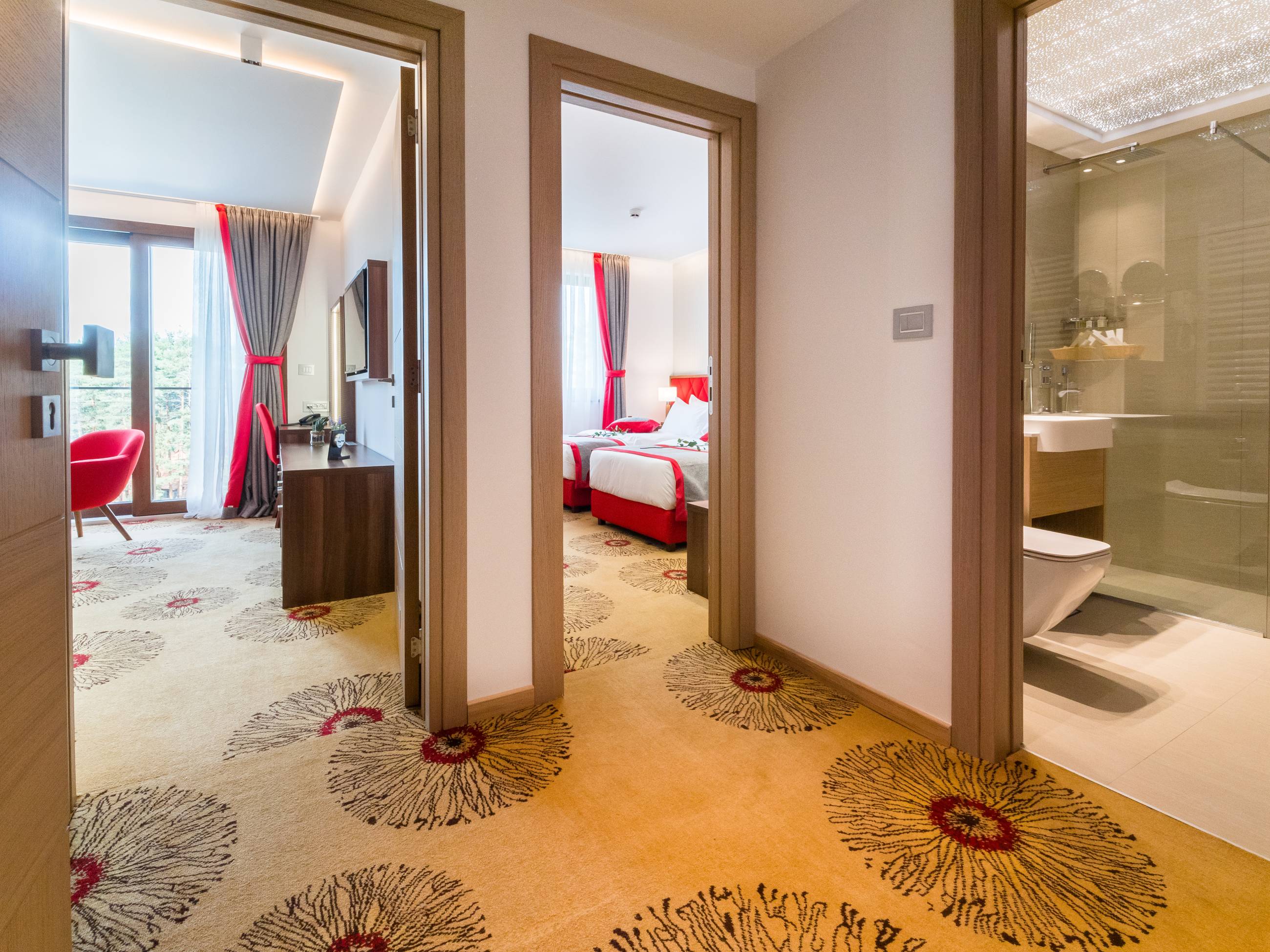 Kapacitet: 1 - 4 osobeSpavaća soba i dnevni boravakGarnitura za sedenje i spavanje u dnevnom boravkuVeličina 31 – 38 m2Francuski ležaj ili dva odvojena ležajaBalkonLCD i kablovska televizijaWifiKlimaMinibarSefTelefonTuš kabinaPodno grejanjeSušači peškiraBade mantilPapučeFenToaletni stočić sa ogledalomDečiji krevetac na zahtev gosta